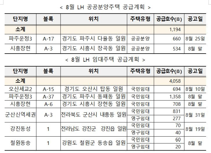 이번 달 공급하는 주택은 ▲공공분양 1194호 ▲국민임대 3721호 ▲영구임대 337호다. 이들 주택은 경기도·강원도·전라남도·전라북도에 위치한 8개단지에서 공급된다.