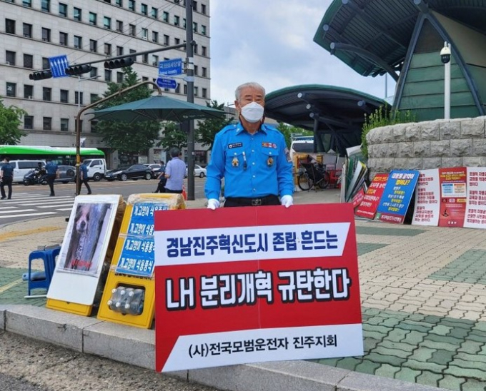이런 가운데 진주시의 교통 봉사단체인 모범운전자연합회 경남진주지회(회장 고무열), 진주시 헌병전우회(회장 김승열), 사랑실은교통봉사대 진주지대(지대장 김상식) 등 3개 단체가 4일부터 오는 6일까지 3일간 국회 의사당 앞에서 LH 해체를 반대하는 1인 시위를 이어나갈 방침이다.