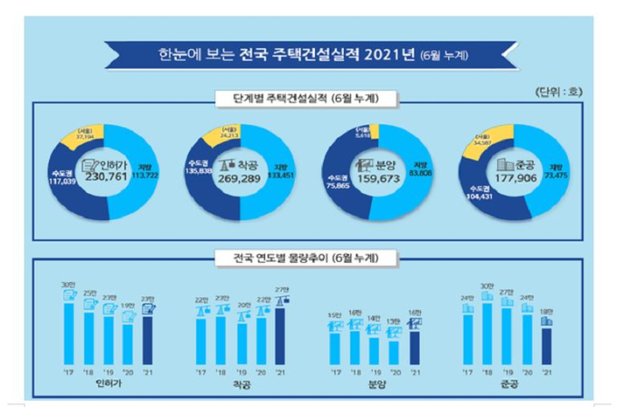 6월 누계 주택 착공실적은 전국 26만9289로로 지난해 동기보다 23.5% 늘었다. 수도권은 13만5838호, 지방은 13만3451호로 같은 기간 각각 10.5%, 40.1% 증가했다.