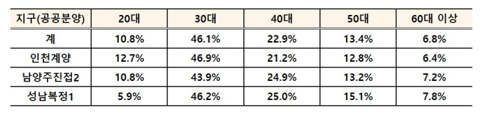 공공분양의 연령별 신청자 비중을 보면 30대 신청자 비중이 가장 높은 곳은 인천계양으로 46.9%에 달했다. 다만 남양주진접2, 성남복정1도 각각 43.9%, 46.2%를 기록해 큰 차이는 없었다. 20대 신청자 비중은 인천계양이 12.7%로 가장 높았고, 성남복정이 5.9%에 불과했다. 40대와 50대, 60대는 성남복정1에서 각각 25%, 15.1%, 7.8%로 가장 높은 비중을 보였다.
