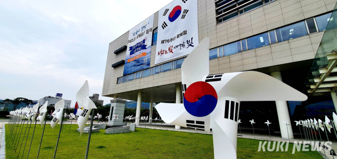 [무안=쿠키뉴스] 신영삼 기자 =제76주년 광복절을 이틀 앞둔 13일 전남도청에 대형 태극기와 태극기 바람개비가 설치됐다.[사진=전남도]