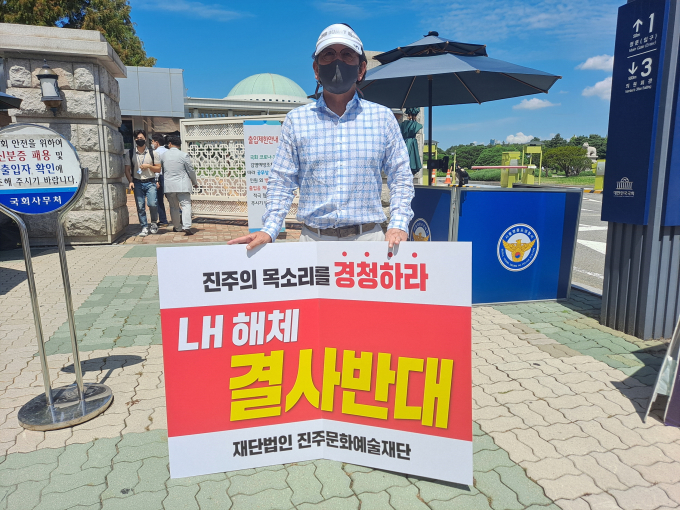[진주=쿠키뉴스] 강연만 기자 = LH 해체 개혁에 대한 진주시민의 반대 목소리가 점점 높아지는 가운데 진주문화예술재단(이사장 서영수)이 19일 국회의사당 앞에서 LH 해체를 반대하는 릴레이 1인 시위에 동참했다.