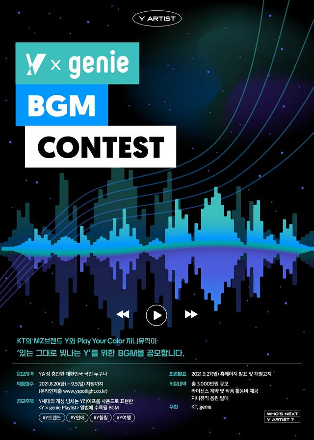KT는 ‘Y 아티스트 프로젝트’ 일환으로 지니뮤직과 함께 감각 있는 신진 뮤직 아티스트를 발굴하는 ‘배경음악 공모전’을 연다.