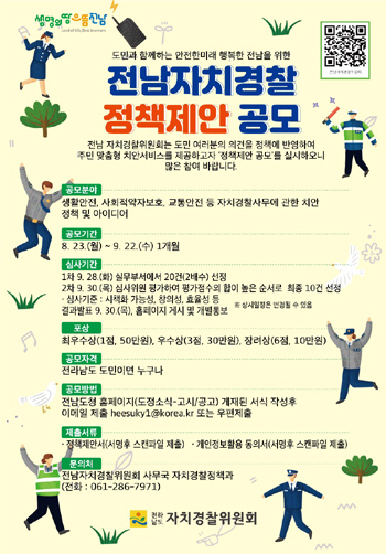 조만형 전남도자치경찰위원장은 “이번 정책제안 공모가 도민의 치안정책 참여의 마중물이 될 것으로 기대한다”며 “앞으로도 안전한 전남을 위한 치안정책에 도민의 목소리를 적극 반영하겠다”고 말했다.