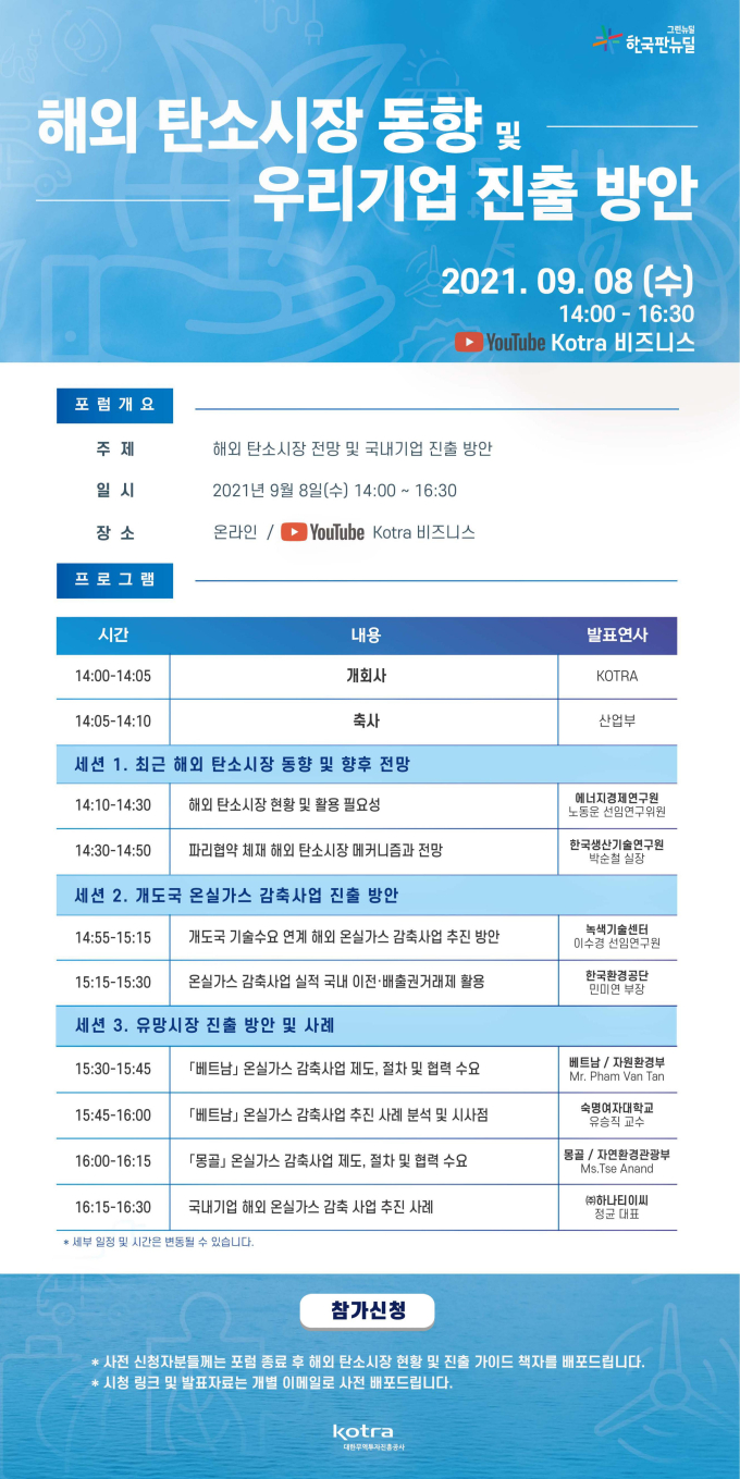 한편, 코트라는 이번 보고서와 연계해 내달 8일 ‘해외 탄소시장 동향 및 우리 기업 진출 방안 설명회’를 개최한다. 설명회에서는 ▲최근 해외 탄소시장 동향 및 전망 ▲온실가스 감축 관련 개도국 시장 진출 방안 ▲베트남·몽골 등 유망국가 온실가스 감축 추진 사례 등이 다뤄지며, 코로나 상황을 감안 유튜브 ‘KOTRA 비즈니스 채널’에서 참여할 수 있다.