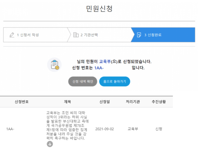 민원인 A씨는 1일 한 온라인 커뮤니티를 통해 교육부에 부산대 징계처분을 촉구하는 민원을 신청했다고 밝히면서 "조씨의 대학성적이 3등이라는 허위사실을 발표했다"며 "조씨의 입학 취소 판단은 지극히 원칙에 따른 결정이지만, 공정한 입시제도를 구축하고 관리·감독해야 하는 대학의 위신을 땅에 떨어뜨렸다"고 지적했다.