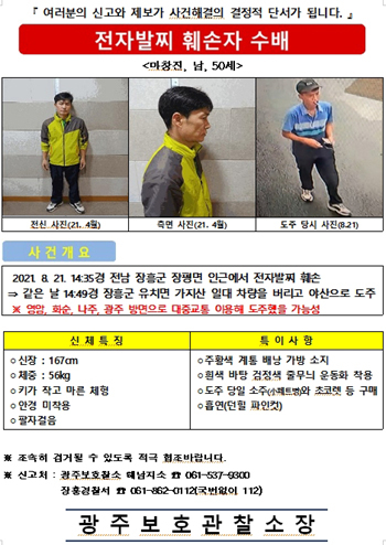 마 씨는 지난 8월 21일 오후 2시 35분경 장흥군 장평면 인근에서 전자발찌를 끊고 자신의 차량으로 이동, 49분경 장흥군 유치면 가지산 일대에 차를 버리고 야산으로 도주했다.