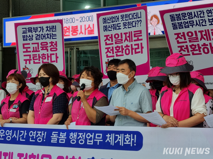 노조는 기자회견문을 통해 교육부가 8월 4일 초등 돌봄교실 운영 개선방안으로 돌봄교실 확충, 돌봄교실 운영시간 연장과 돌봄전담사의 적정근무시간 확보 및 돌봄전담사 중심의 행정 지원 체계 구축, 지원청 주도의 거점돌봄기관 시범운영 추진 등을 발표했다며 이같이 요구했다.
