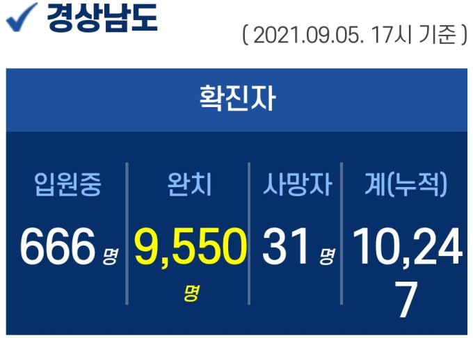5일 오후 5시 기준, 경남도내 입원 중인 확진자는 666명이고, 퇴원 9550명, 사망 31명, 누적 확진자는 총 10247명입니다.