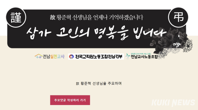 단체들은 “꿈 많던 젊은교사의 죽음이 헛되지 않도록, 교육부와 전라남도교육청은 교육공동체로서 유족들의 마음을 보듬어드리고, 故 황준혁 선생님의 순직 처리 외 가능한 예우를 다하기 위해 조속히 노력하기를 촉구한다”고 덧붙였다.