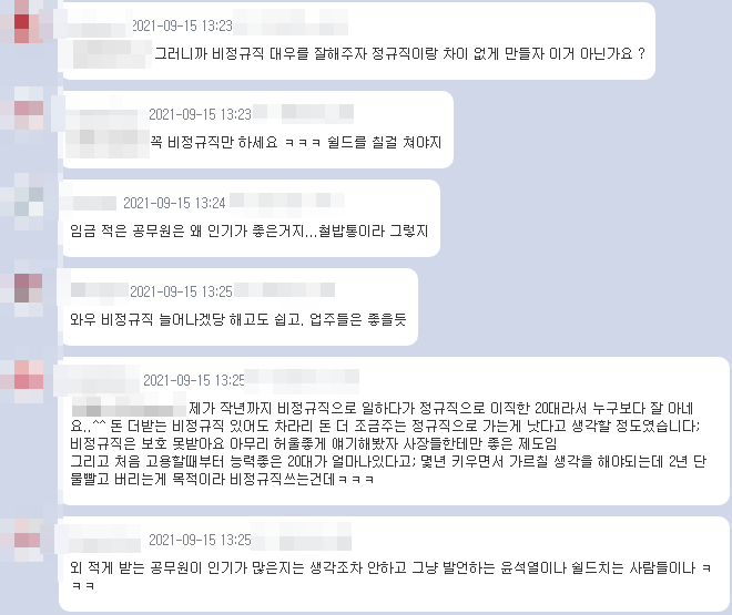 한 누리꾼들은 친야 성향의 온라인 커뮤니티에 "지난해까지 비정규직으로 일하다 정규직으로 이직한 20대이다"라며 "돈 더 받는 비정규직에 있어도 차라리 돈 덜 주는 정규직으로 가는게 낫다고 생각할 정도로 보호받지 못했다"며 분통을 터뜨렸다.