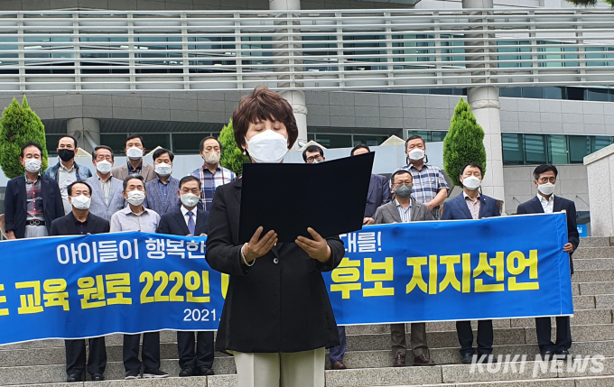 임태준, 김선홍, 김재인 전 교육국장과 이종범 전 행정국장, 박선미, 윤주신, 김재오, 최은식, 왕명석 전 교육장 등이 대표로 참석한 가운데 전남지역 전직 교육장과 전남교육청 국‧과장 등 교육가족 222명은 16일 오전 11시 전남도교육청 앞에서 기자회견을 열고 이재명 지사 지지를 선언했다.