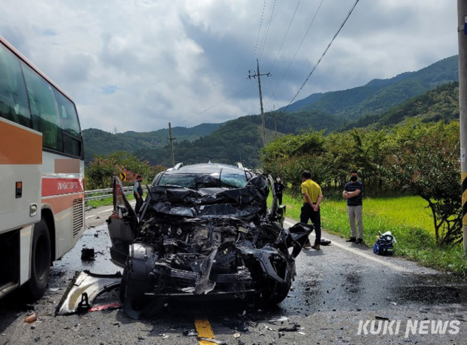 화순경찰에 따르면 이날 낮 12시 20분경 사평면 왕복 2차선 국도에서 E(35)씨가 몰던 모하비 차량이 광주 방면으로 가던 승용차와 고속버스를 차례로 충돌했다.