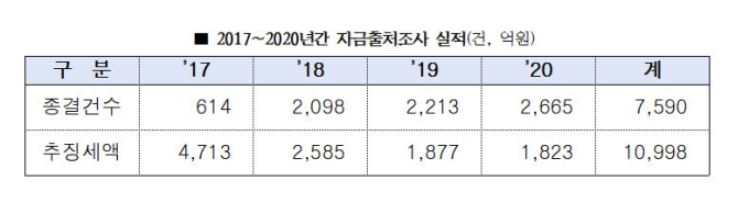 조사건수가 급격히 증가했지만 추징세액은 되레 감소했다. 2017년 4713억원에서 2018년 2585억원, 2019년 1877억원으로 급감했고, 2020년에도 1823억원으로 감소세가 이어졌다. 2017년 대비 추징액 규모는 61.3%나 줄어들었다.