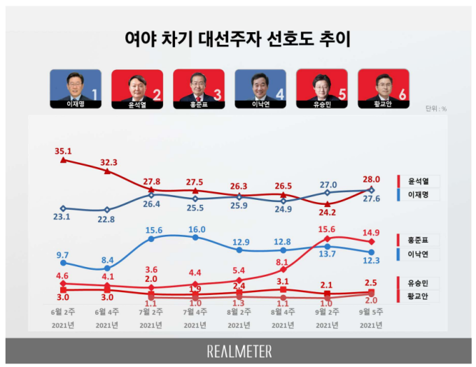 30일 여론조사 전문기관 리얼미터는 오마이뉴스 의뢰로 지난 27일(월)~28일(화) 이틀간 전국 만 18세 이상 성인 남녀 2043명(4만115명 접촉, 응답률 5.1%)을 대상으로 차기 대선주자 선호도를 조사한 결과, 국민의힘 윤석열 후보가 9월 2주차 조사 대비 3.8%포인트 상승한 28.0%로 1위에 올랐다.