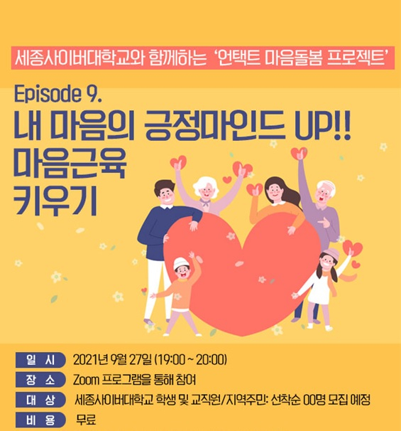 이번 프로그램은 줌 프로그램을 통해 진행하는 언택트 마음돌봄 프로젝트이며, 시간과 장소에 구애받을 필요 없이 누구나 참여할 수 있다. 언택트 마음돌봄 프로젝트는 매 달 새로운 에피소드로 진행하며, 세종사이버대학교 상담심리학과 김기호 교수(임상심리전문가)는 “본 프로그램을 통해 우리 안의 마음 근육을 찾아보고, 이를 통해 스트레스 상황에서 대처할 수 있는 힘을 키워볼 수 있으셨기를 바랍니다”라고 밝혔다.