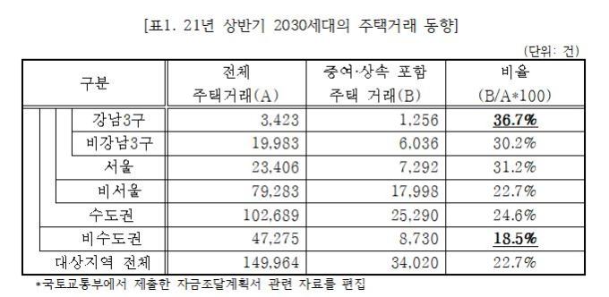 5일 강준현 의원(더불어민주당, 국토위)이 2017년 하반기부터 2021년 상반기까지의 자금조달계획서(주택취득자금 조달 및 입주계획서) 123만 7243건을 분석한 결과에 따르면, 2021년 상반기에 강남3구에서 집을 산 2030세대 중에 증여·상속을 끼고 산 비율은 36.7%로, 비수도권 지역 18.5%의 두배에 달했다.