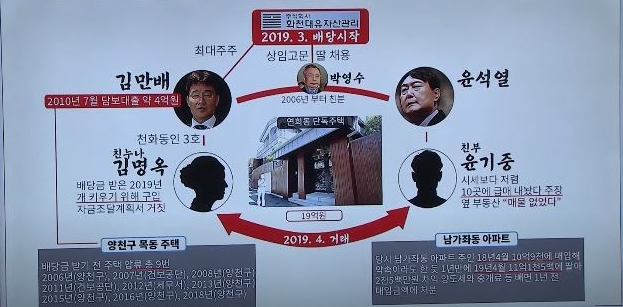 이어 김교흥 의원은 윤석열 전 검찰총장 장모의 농지법 위반 의혹을 거론했다. 그는 먼저 “운석열 전 검찰총장의 장모는 2006년 경기도 공흥리 일대의 토지를 매입했다. 농지는 자가경영하겠다며 사들였다. 5년 뒤 자투리땅도 매입했다”면서 “그렇게 사들인 농지와 임야 6000평 가량에 아파트를 지어 100억원을 벌었다”고 밝혔다. 특히 그는 농지와 임야 개발 과정에서 특혜가 있었다는 의심도 내비쳤다. 김 의원은 “(장모 측은) 2014년에 시공사 선정하고 11월 시행기간 만료에도 연장 하지 않았다. 불법으로 시공을 한 것”이라며 “2016년 6월 연장을 신청하자 양평군에서 2014년 11월부터 2016년 7월까지 소급적용해 시행기간을 연장해 줬다”고 밝혔다. 그러면서 당시 양평군수였던 김선교 국민의힘 의원과 여주지청장을 거친 윤석열 전 검찰총장의 커넥션을 의심했다.