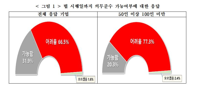 8일 중소기업중앙회와 한국경영자총협회가 50인 이상 기업 314개사를 대상으로 실시한 ‘중대재해처벌법 이행준비 및 애로사항 기업 실태조사 결과’에 따르면, 법 시행일까지 시행령에 규정된 안전보건 확보의무 준수가 어렵다는 응답이 66.5%에 달했다.