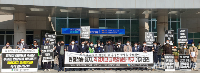 오전에는 전남청소년노동인권센터가 전남교육청 본관 앞에서 기자회견을 열어 현장실습 폐지와 직업계고 교육 정상화를 요구하고, 요구서를 전남교육청에 전달했다.