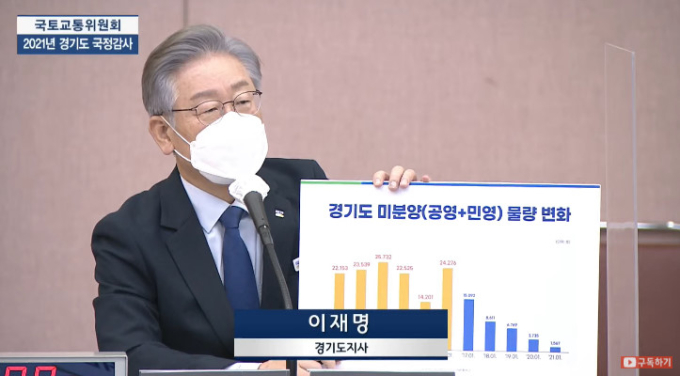 [쿠키뉴스] 조계원 기자 =20일 열린 경기도청에서 열린 국토교통위원회 국정감사에서 대장동 개발 환수 이익이 도마에 올랐다. 성남시 환수율이 10%에 불과하다는 전날 경실련 발표에 이어 심상정 의원(정의당)이 국감 현장에서 이 문제를 재차 거론하고 나섰다. 이에 이재명 경기도 지사는 70%의 개발 이익을 환수했다고 반박했다. 특히 이 지사는 국민의힘의 방해가 없었다면 100% 환수가 가능했다고 주장했다.