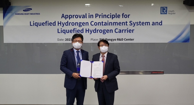 삼성중공업은 영국 선급인 로이드(Lloyd)사로부터 조선업계 최초로 '멤브레인형 액화수소 저장탱크 및 16만㎥ 액화수소운반선 개념설계'에 대한 기본 인증을 획득했다고 21일 밝혔다.