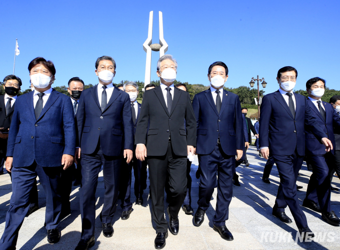 [광주=쿠키뉴스] 신영삼 기자 =더불어민주당 대선 후보인 이재명 경기도지사가 22일 오전, 김영록 전남도지사 등과 함께 광주 국립 5·18 민주묘지를 참배했다.[사진=전남도]