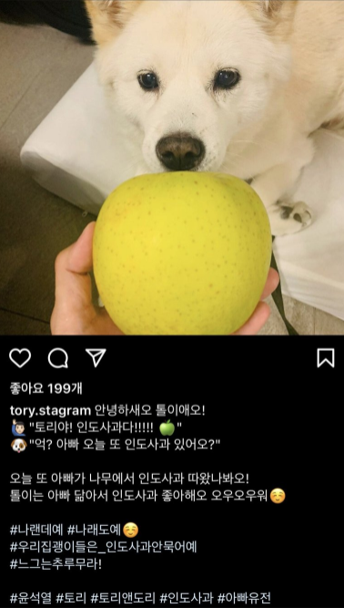 이 게시물에는 "석열이 형은 지금도 과일 중에 사과를 가장 좋아한다" "토리는 아빠를 닮아서 인도 사과를 좋아해요" 등의 글이 적혔다.