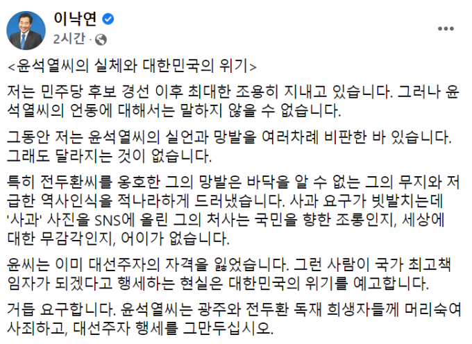 이 전 대표는 22일 자신의 페이스북에 "민주당 후보 경선 이후 최대한 조용히 지내고 있었다"며 "그러나 윤석열 씨의 언동에 대해서는 말하지 않을 수가 없었다"고 운을 뗐다.