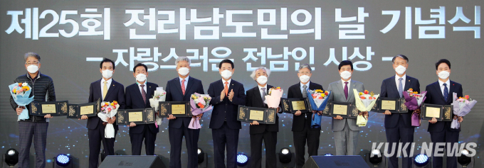 기념식에서는 또 2021년 전남을 빛낸 인물 9명에게 ‘자랑스러운 전남인 상’을 시상했다. 경제 분야 정철섭 ㈜승진엔지니어링 대표, 문화‧관광‧체육 분야 장영인 순천대학교 명예교수, 하철경 호남대학교 교수, 신정식 전남축구협회장, 염혜선 대전KGC인삼공사프로배구단 선수가 수상했다.