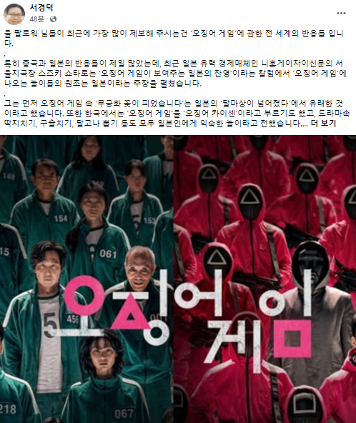 서 교수는 5일 자신의 페이스북에 "최근 일본 유력 경제매체인 니혼게이자이신문의 서울지국장 스즈키 쇼타로는 '오징어 게임이 보여주는 일본의 잔영'이라는 칼럼에서 '오징어 게임'에 나오는 놀이들의 원조는 일본이라는 주장을 펼쳤다"고 전했다.