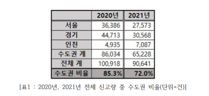 한국인터넷자율정책기구(KISO) 부동산매물클린관리센터가 5일 발표한 1~3분기 허위매물신고 분석 현황에 따르면 올해 3분기까지 수도권 지역의 신고량은 6만5528건으로 전년 동기간(8만6034건)보다 2만 건 이상 감소했다. 비율로 살펴보면, 올해 전체 신고량 중 수도권이 차지하는 비율은 약 72%로 전년 동기간(85.3%)에 비해 13.3% 감소한 수치다.
