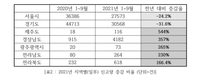 올해 1~3분기 부동산 허위매물 신고량 중 비수도권이 차지하는 비율이 지난해 같은 기간보다 13.3% 증가했다. 특히 제주도와 경상남도, 광주광역시의 허위매물 신고가 폭증했다.