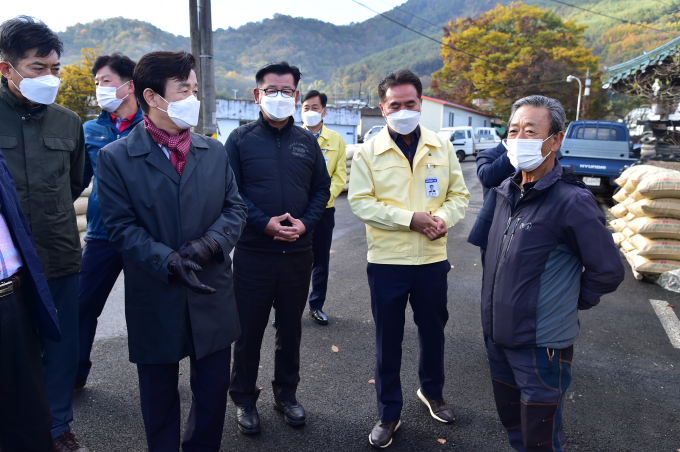 조규일 진주시장이 9일 오전 2021년산 공공비축미 건조벼 첫 매입 현장인 진성면 가좌마을을 찾아 농업인과 관계자를 격려했다.