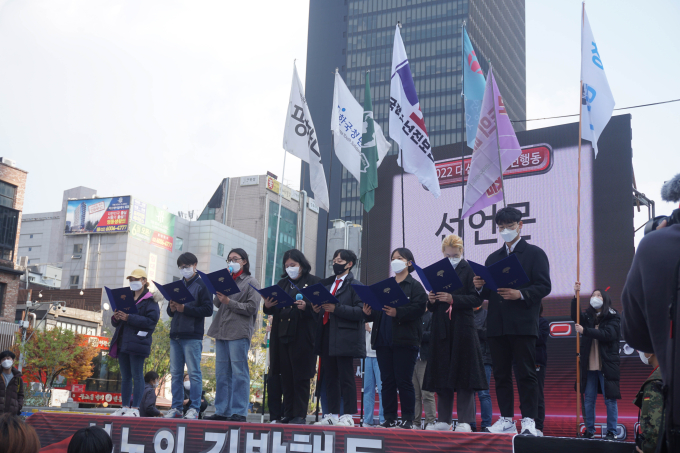 행사 참여 단체 대표들이 선언문을 낭독하고 있다. 사진=차종관 객원기자 이 집회에 이어서 청계천 한빛광장에서는 교-사대 대선대응 공동행동, 더 이상 참을 수 없는 대학생들의 행진 ‘출격’ 등 집회가 열릴 예정이다.