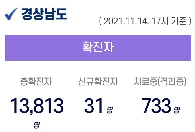 14일 오후 5시 기준, 경남도내 입원 중인 확진자는 733명이고, 퇴원 1만 3037명, 사망 43명, 누적 확진자는 총 1만 3813명이다.