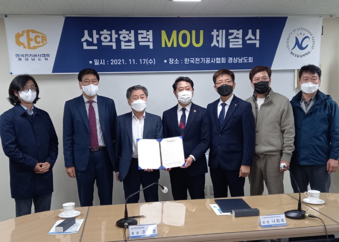 17일 오전 한국전기공사협회 경남도회 회의실에서 열린 업무협약 체결식에는 조현명 총장, 나희욱 회장 등 양 기관 관계자 10여 명이 참석했다.