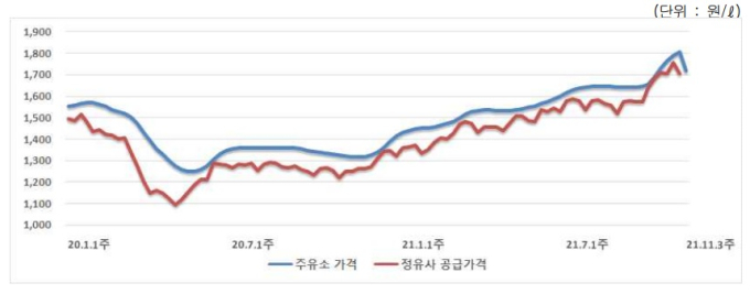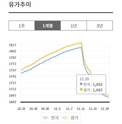 지역별로 최고가 지역인 서울의 휘발유 가격이 전주보다 120.0원 하락한 리터당 1765.4원을 기록했다. 최저가 지역 대구는 107.3원 내린 리터당 1680.9원이었다.