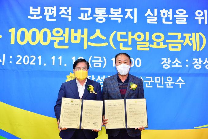 1000원 버스 운영으로 인한 농촌버스의 운송 수입 손실은 군비로 보전한다. 군은 이를 위해 지난 19일 장성공영터미널에서 ㈜군민운수와 업무협약을 체결했다.