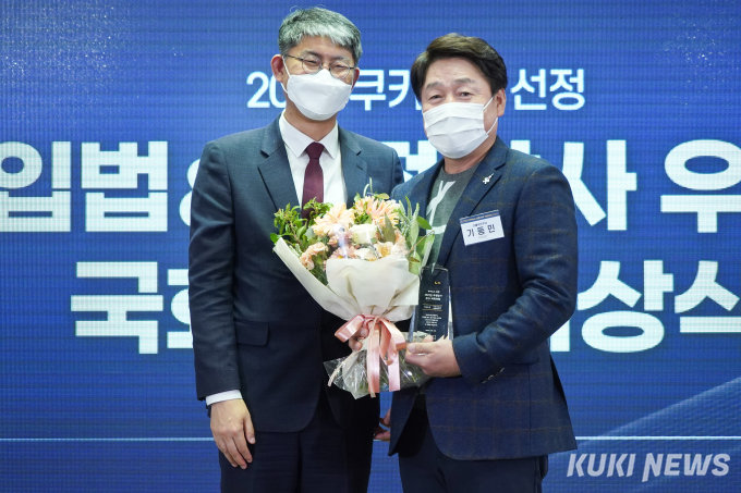 김지방 쿠키미디어 대표와 기동민 더불어민주당 의원이 23일 서울 여의도 국민일보 12층 컨벤션홀에서 열린 국정감사우수의원 시상식에서 기념촬영을 하고 있다. 기 의원은 이번 시상식에서 2021 국방위원회 국정감사우수의원으로 선정됐다.
