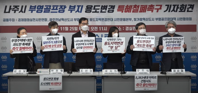 경제정의실천시민연합(경실련)은 25일 기자회견을 열고 나주 부영골프장 잔여부지 용도변경과 관련해 “부영주택에 대한 과도한 특혜를 즉각 철폐하라”고 촉구했다.
