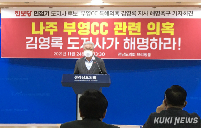 민점기 진보당 전남도지사 후보는 지난 24일 오후 전남도의회 브리핑룸에서 기자회견을 열고 “나주판 대장동으로 일컬어지는 나주부영CC 특혜의혹으로 뜨겁다”면서, 나주시와 나주시의회, 나주시민들도 대응에 안간힘을 쓰고 있음에도 정작 도시계획 변경 결정 권한을 가진 전남도는 나주시 뒤에 숨어 모르쇠로 일관하고 있다고 비판했다.