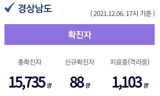6일 오후 5시 기준, 경남도내 입원 중인 확진자는 1103명이고, 퇴원 1만 4574명, 사망 58명, 누적 확진자는 총 1만 5735명이다.