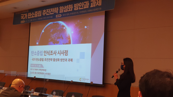 13일 오후 2시 서울 여의도 전경련회관 콘퍼런스센터에서 열린 대한전기협회 제8차 전력정책포럼에서 김소희 기후변화센터 사무총장은 ‘국가 탄소중립 추진전략 활성화 방안과 과제’라는 주제로 탄소중립 인식조사 결과를 발표했다.