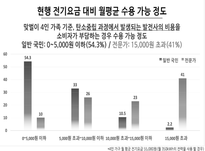 탄소중립을 위해 현행 전기요금이 인상될 경우, 어느 금액까지 수용이 가능한지 묻는 질문에는 일반 국민 절반가량(54.3%)이 ‘5000원 이하’면 가능하다고 답했다.