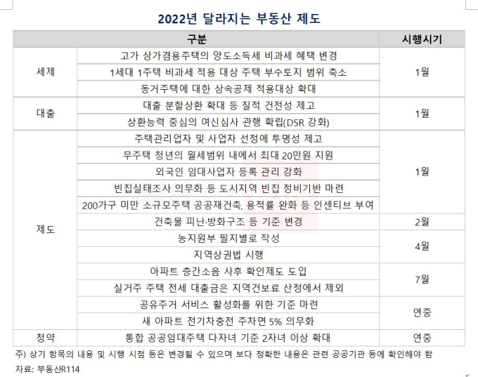 가계부채 급증을 막기 위해 차주단위 DSR 확대적용 계획이 앞당겨 시행되고, 제2금융권의 DSR 기준이 강화된다. 2022년 1월부터 주택담보대출과 신용대출, 카드론 등을 합한 총 대출액이 2억원을 넘으면 개인별 DSR 규제가 적용된다. 7월부터는 총 대출액 1억원 초과 시로 DSR 규제가 확대된다. 이와 함께 제2금융권 60%로 적용되는 DSR 기준도 1월부터 50%로 하향 조정된다. 이전에 비해 대출 가능금액이 줄면서 주택 구매력 감소가 불가피할 전망이다.