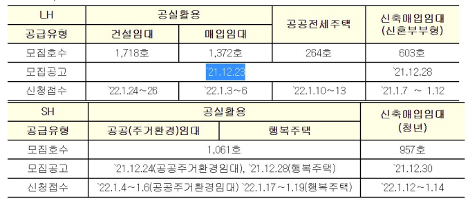 LH는 전세형으로 전환한 공공임대 공실(3090가구)과 공공전세주택(264가구), 신혼부부용 신축 매입임대주택(603가구) 등 총 3957가구의 입주자를 모집한다.