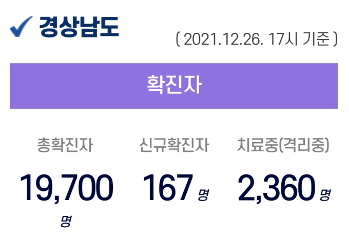 경상남도는 26일 오후 1시 30분 대비 도내 신규 확진자 86명(경남 19623~19708번)이 추가 발생해 누적 확진자는 1만 9700명이다고 밝혔다.