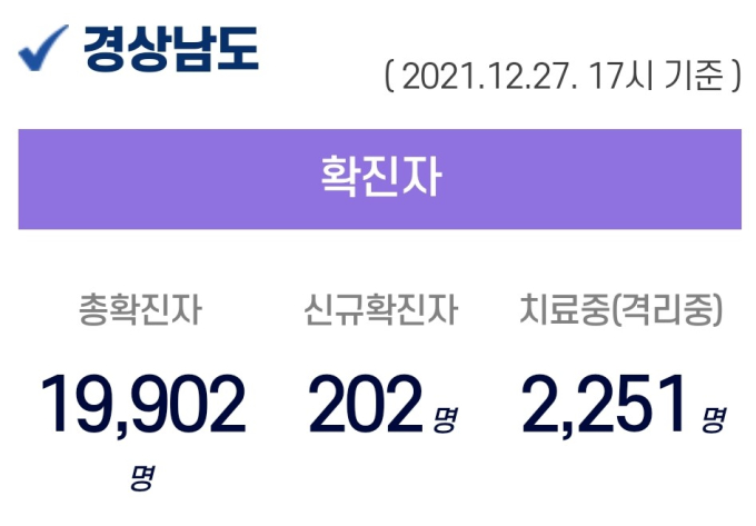 27일 오후 5시 기준, 경남도내 입원 중인 확진자는 2251명이고, 퇴원 1만 7572명, 사망 79명, 누적 확진자는 총 1만 9902명이다.