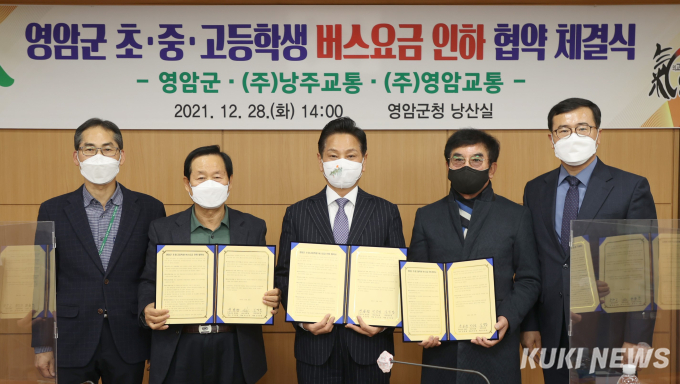 영암군은 지난 28일 군청 낭산실에서 전동평 영암군수와 박상영 ㈜낭주교통 대표, 김영열 ㈜영암교통 대표가 참석한 가운데 ‘영암군 초‧중‧고등학생 버스요금 인하’업무협약을 체결했다.